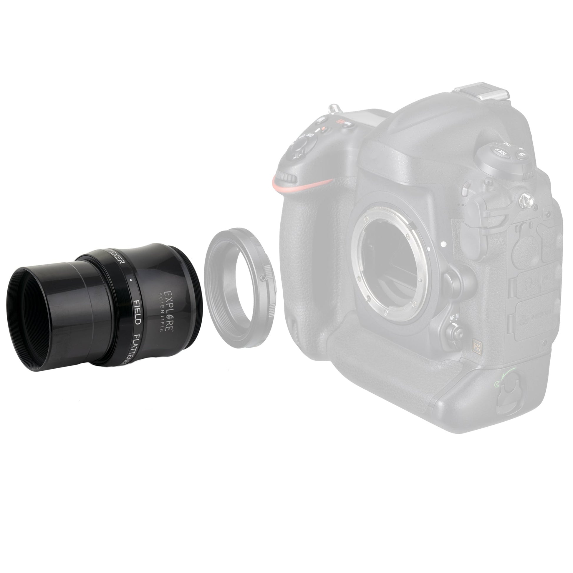 The Explore Scientific field flattener is designed to work with telescopes with focal ratios between f/5 and f/7. Our device requires 55 mm (+/-2 mm) of spacing between the back of the device and the camera sensor.