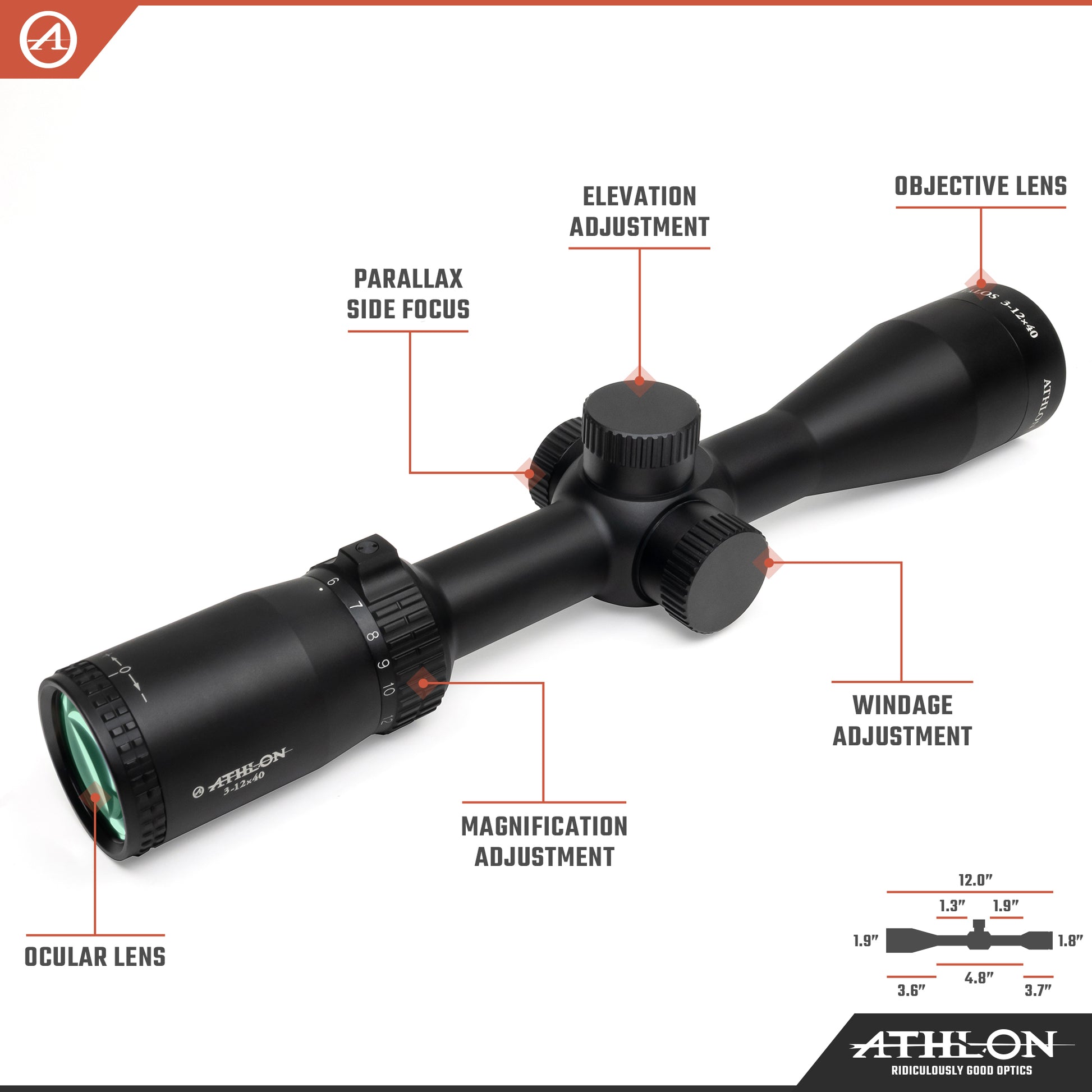 Athlon Optics Talos 3-12x40, Capped , Side Focus, 1 inch, SFP, Mil-Dot
